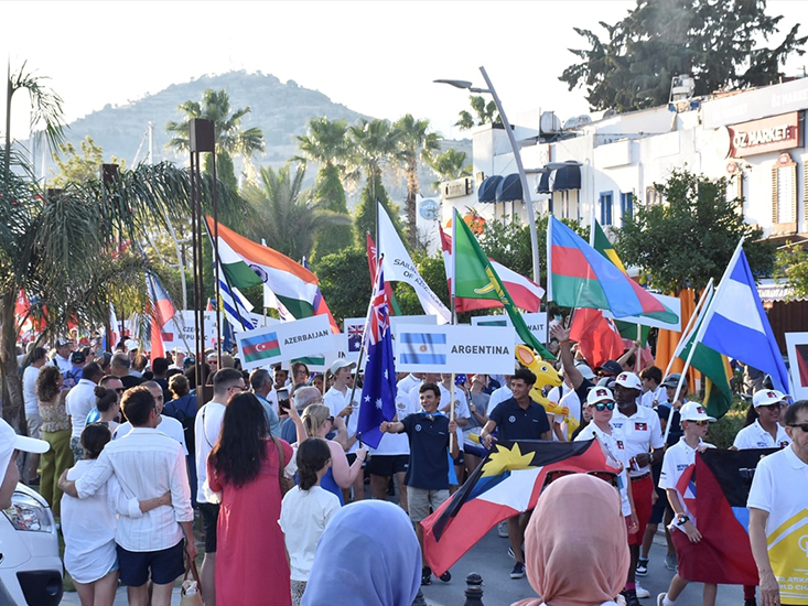Uluslararası Optimist Sınıf Birliği (IODA) tarafından düzenlenen yarışlar için ilçeye gelen sporcular, kortej yürüyüşüne katıldı. Ellerinde ülke bayraklarını taşıyan sporcular, bando eşliğinde marinadan başlayıp Bodrum Kalesi'ne kadar yürüdü.