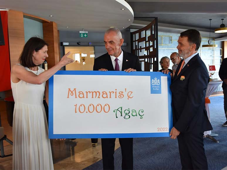 Hollanda'nın Ankara Büyükelçisi Marjanne de Kwaasteniet, Marmaris'te geçen yıl yanan ormanlara dikilmek üzere 10 bin fidan bağışı çekini Marmaris Kaymakamı Ertuğ Şevket Aksoy'a teslim etti.