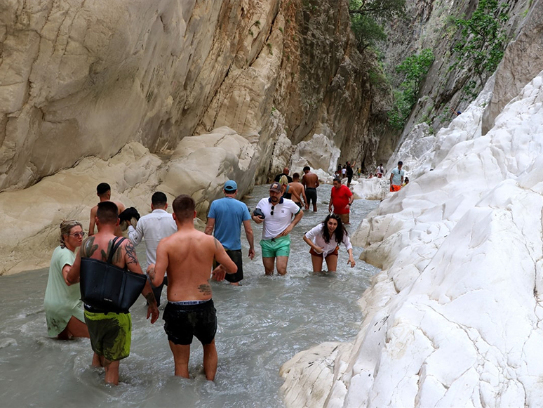 Akıntının fazla olduğu yerlere konulan halat yardımıyla kanyona giren tatilciler, dar ve yüksek kayalıklar arasında ilerlemeye çalıştı. Bazı tatilciler kanyon içinde bulunan çamuru vücutlarına sürdü.