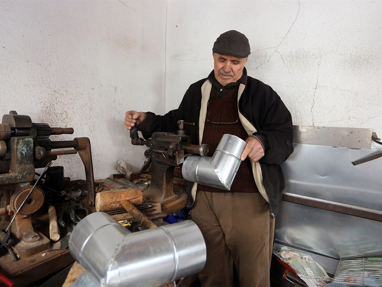 Yaklaşık 47 yıldır kent merkezindeki tarihi Arasta Çarşısı'nda bulunan 10 metrekarelik dükkanında çalışmaya devam eden 68 yaşındaki Abra, sac levhaları soba ve mangal borusu gibi eşyalara dönüştürerek hayatını sürdürüyor.