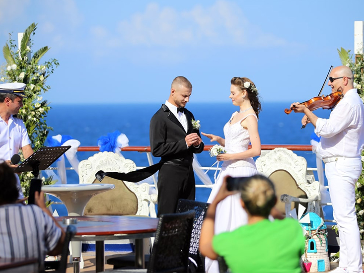 Alışveriş yapma imkanı olan, eğlencenin kesintisiz sürdüğü gemiyi "denizci nikahı" kıydırmak isteyen çiftler de tercih ediyor.