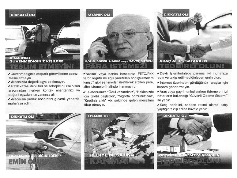 Telefon görüşmeleri esnasında arka plandan gelen telsiz seslerine ve korku, panik yaratma amaçlı senaryolara katiyen itibar etmeyin. Telefonunuza gelen SMS metinlerinde aramanızı istedikleri numaraları kesinlikle aramayın. Kimlik ve kredi kartı bilgilerinizi sakın paylaşmayın. Böyle bir durumla karşılaşmanız halinde lütfen hemen 155 POLİS İMDAT hattını arayın ya da en yakın Emniyet Birimine müracaat edin.