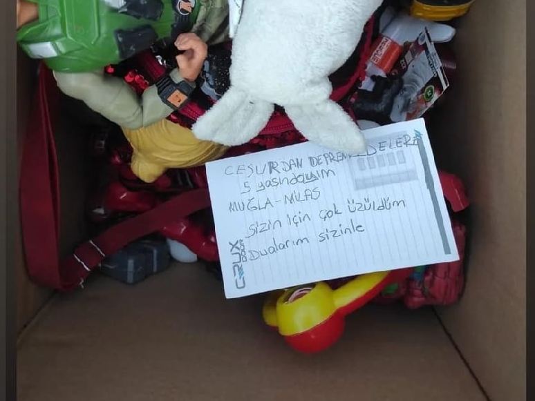 Oyuncaklar arasından çıkan notlarda 5 yaşındaki Cesur “Sizin için çok üzüldüm. Dualarım sizinle.” derken, 6 yaşındaki Sarp ise “Geçmiş olsun. Sizi Seviyorum.” diyerek afetzede arkadaşlarına mesaj gönderdi.